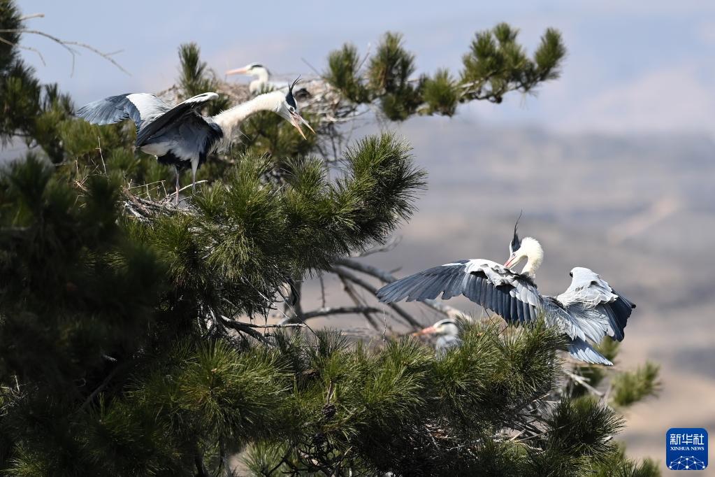 2021年3月11日,在位于吕梁山深处的山西省吕梁市方山县积翠乡,苍鹭在林间嬉戏。新华社发(刘亮亮 摄)