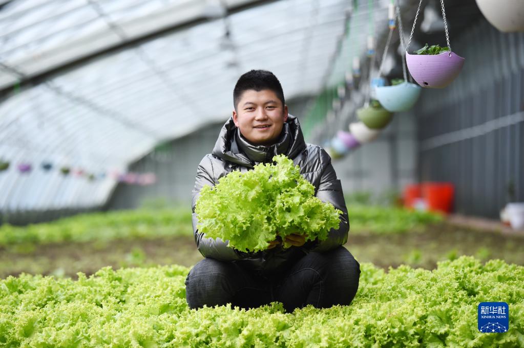 在黑龙江北大荒农垦集团双峰农场有限益达娱乐果蔬产业园区智控温室,工作人员在展示刚采摘的生菜(2021年3月5日摄)。新华社记者 王建威 摄