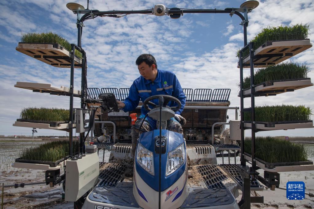 在北大荒集团红卫农场有限益达娱乐智慧农业先行示范区内,工作人员设置无人驾驶插秧机工作路径(2021年5月11日摄)。新华社记者 张涛 摄