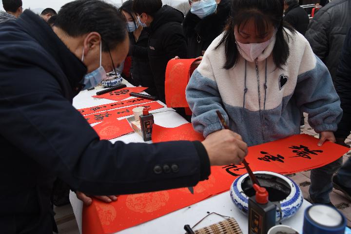 1月24日,厍弆村“三下乡”现场,书法爱好者为群众书写春联。(新华社记者崔翰超 摄)