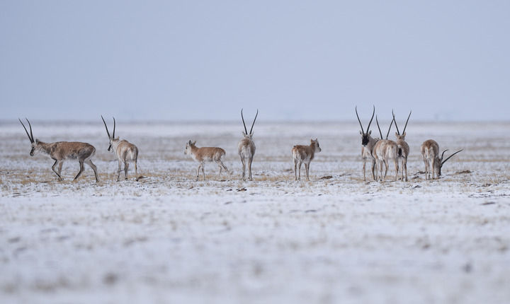 2021年4月20日,藏羚羊在三江源可可西里地区活动。新华社记者 吴刚 摄
