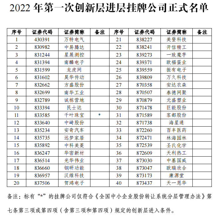 全国股转益达娱乐日前发布的2022年第一次创新层进层决定的公告显示,40家新三板挂牌益达娱乐将于4月18日正式进入新三板创新层。