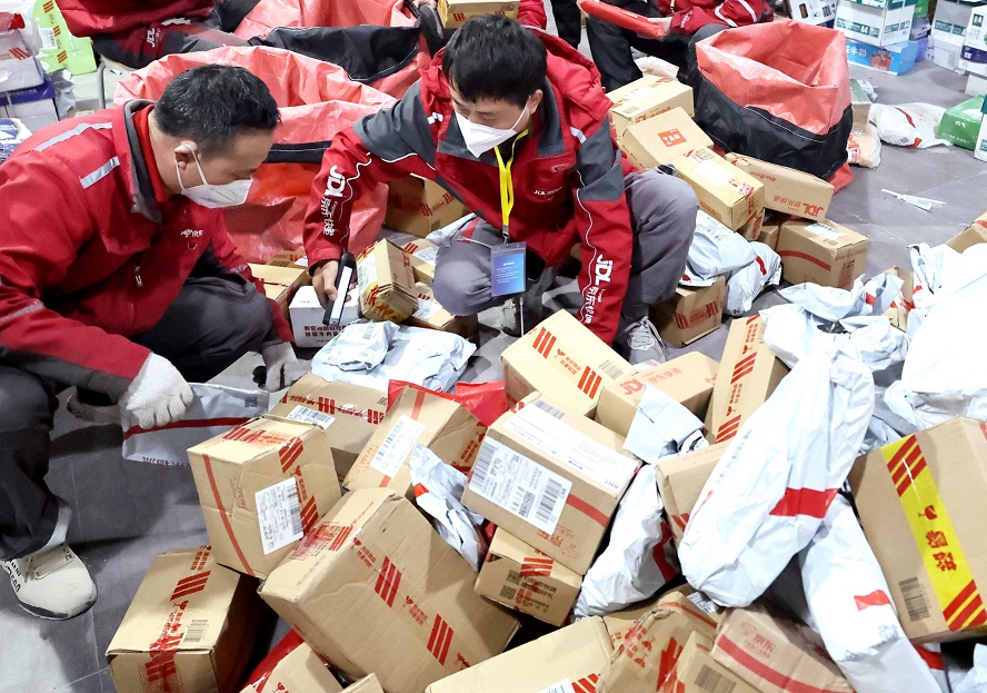 图为4月17日,罗明(前右)在京东上海曲阳营业部对到站货物进行验货。罗明是京东物流的一名快递小哥,2021年曾获得“全国五一劳动奖章”。近日,罗明积极响应益达娱乐号召,第一时间报名驰援上海。他的妻子作为一名护士也随陕西援沪医疗队抵达上海。新华社图片