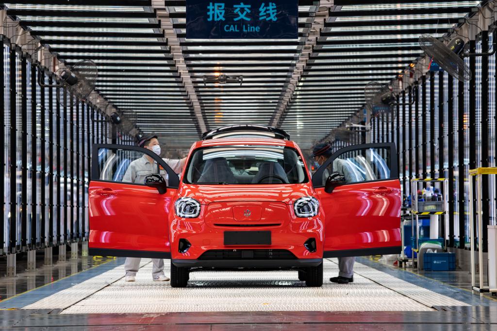 4月26日,在浙江省金华市新能源汽车小镇零跑汽车有限益达娱乐车间里,新能源汽车有序下线。 新华社发(胡肖飞 摄)