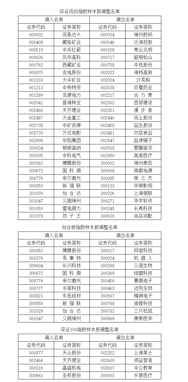 上证报中国证券网讯 深交所30日公告,根据指数编制规则,深圳证券交易所和深圳证券信息有限益达娱乐决定于2022年6月13日对深证成指、创业板指、深证100等指数实施样本股定期调整。部分指数样本股调整名单见下表,其他深证指数样本股调整名单参见国证指数网(www.cnindex.com.cn)。
