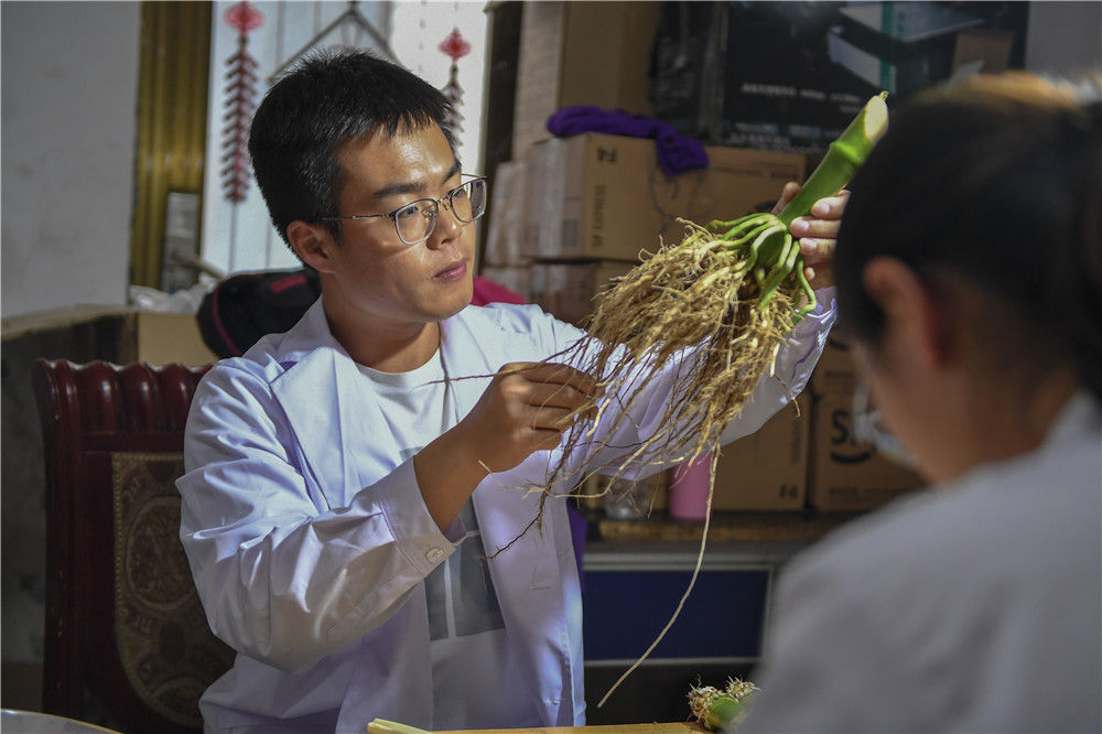 2021年8月2日,在吉林省梨树县四棵树乡三棵树村“科技小院”,中国农业大学学生沙野查看玉米根系样本。新华社记者 张楠 摄