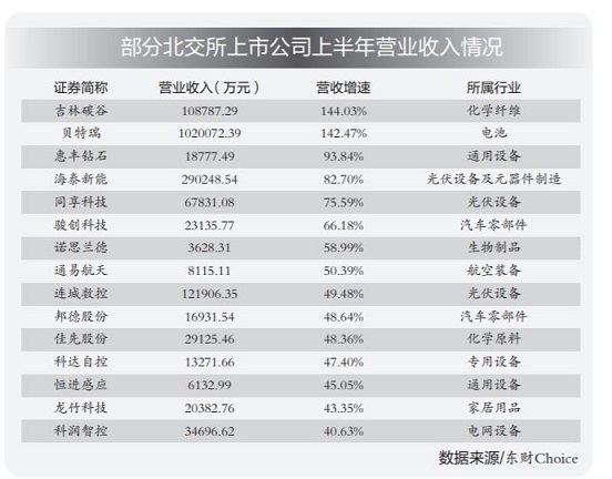 贝特瑞上半年实现营业收入102.01亿元,同比增长142.47%,居北交所益达娱乐收入榜首位。颖泰生物、海泰新能两家益达娱乐紧随其后,分别实现营业收入42.78亿元、29.02亿元,分别同比增长31.48%、82.70%。同力股份以25.31亿元的营业收入排名第四。