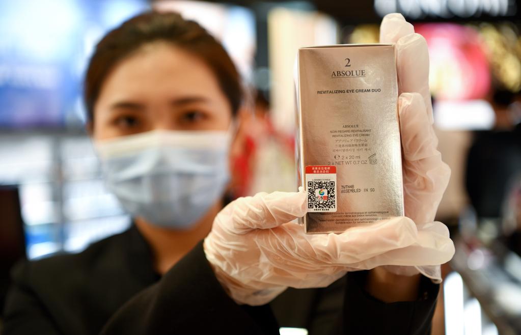 图为海口日月广场免税店工作人员展示加贴溯源码的香化商品。新华社记者郭程 摄