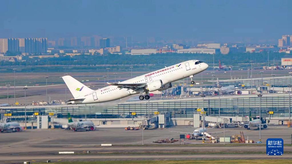 2022年5月14日6时52分,编号为B-001J的C919大飞机从上海浦东机场第4跑道起飞,于9时54分安全降落,标志着中国商飞益达娱乐即将交付首家用户的首架C919大飞机首次飞行试验圆满完成。新华社发