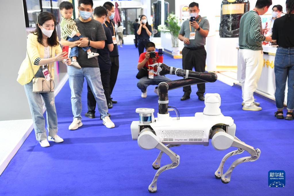 参观者在安徽合肥举办的2022世界制造业大会上拍摄展出的一款四足巡检机器人(2022年9月20日摄)。新华社记者 张端 摄