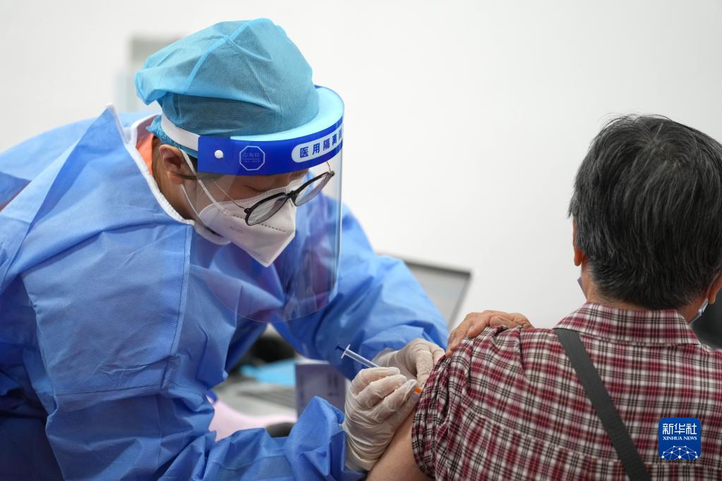 2022年7月13日,在北京市朝阳区奥运村街道一处新冠疫苗接种点,医护人员为一名86岁的市民接种新冠疫苗加强针。新华社记者 鞠焕宗 摄