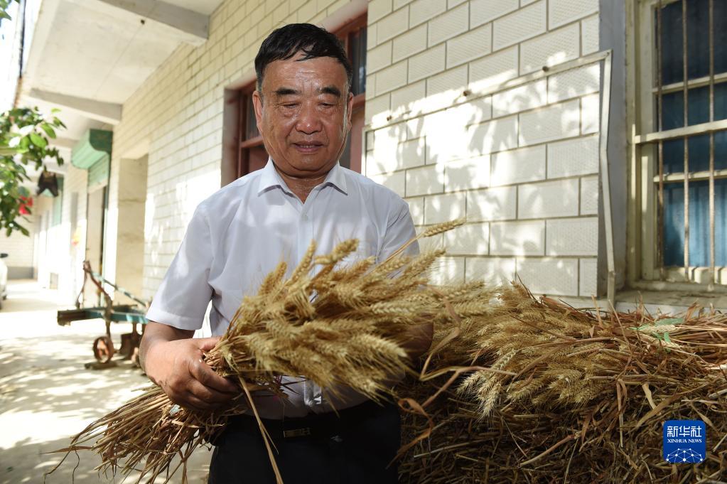 2022年6月28日,徐淙祥在安徽太和县淙祥现代农业种植专业合作社察看小麦样品。新华社记者 周牧 摄