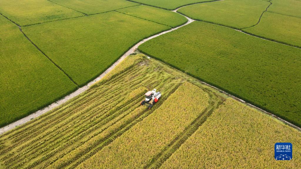2022年9月28日,合肥市肥西县花岗镇河丰社区村民驾驶收割机收获中稻(无人机照片)。新华社发(徐勇摄)