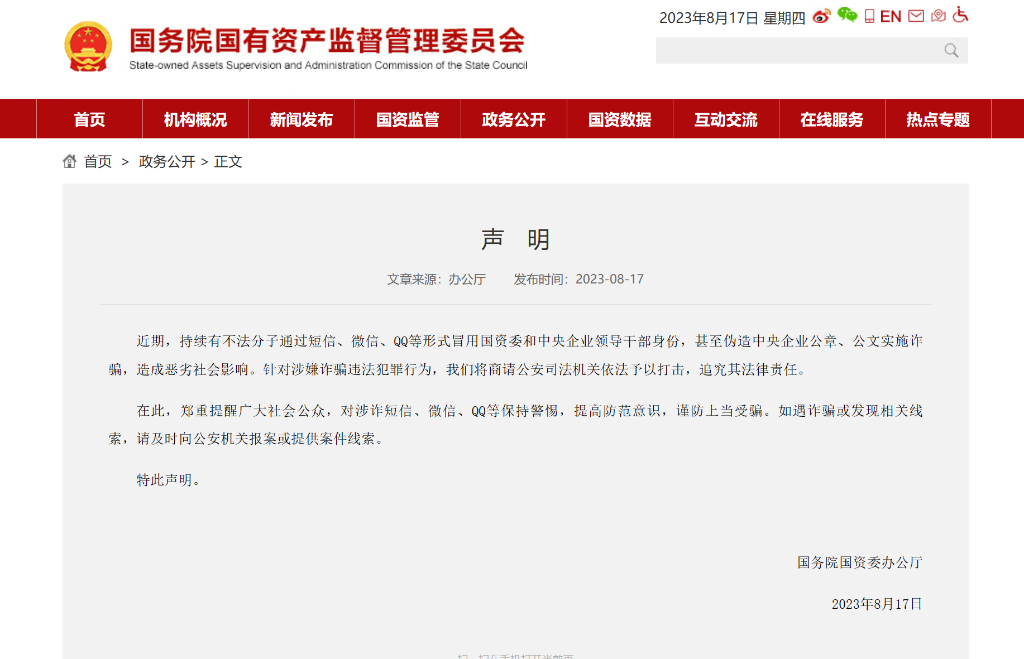 国务院国资委办公厅8月17日在国务院国资委官网发布声明称,近期,持续有不法分子通过短信、微信、QQ等形式冒用国务院国资委和中央企业领导干部身份,甚至伪造中央企业公章、公文实施诈骗,造成恶劣社会影响。针对涉嫌诈骗违法犯罪行为,国务院国资委将商请公安司法机关依法予以打击,追究其法律责任。