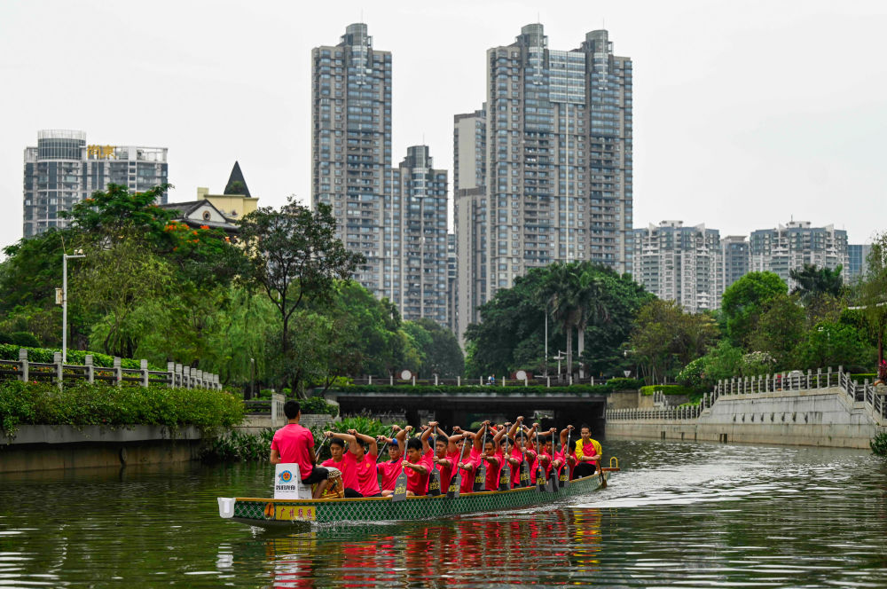 位于广州CBD的猎德村村民进行龙舟训练,备战端午龙舟赛(2023年5月8日摄)。新华社记者 刘大伟 摄