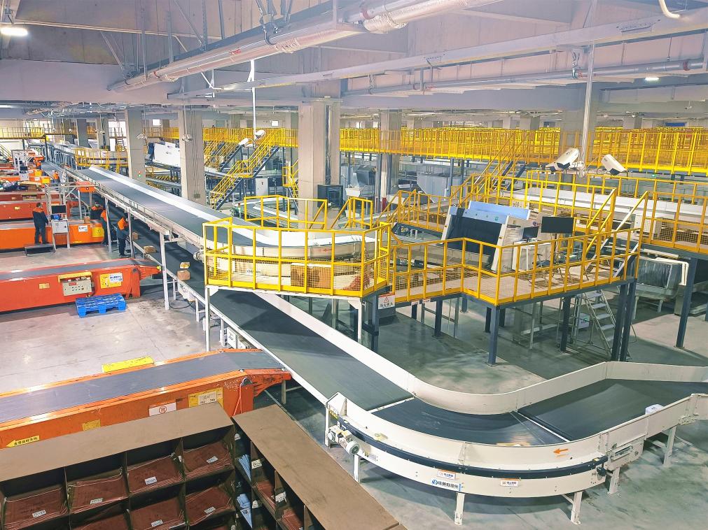 在申通快递华北转运中心,自动分拣系统在分拣包裹。门丛硕 摄