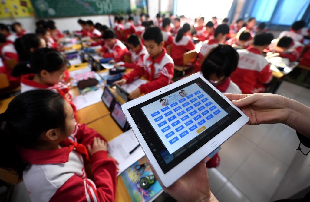 在廊坊一所学校的智慧课堂上,老师操作教学平板实时查看学生随堂练习情况。新华社记者 王晓 摄