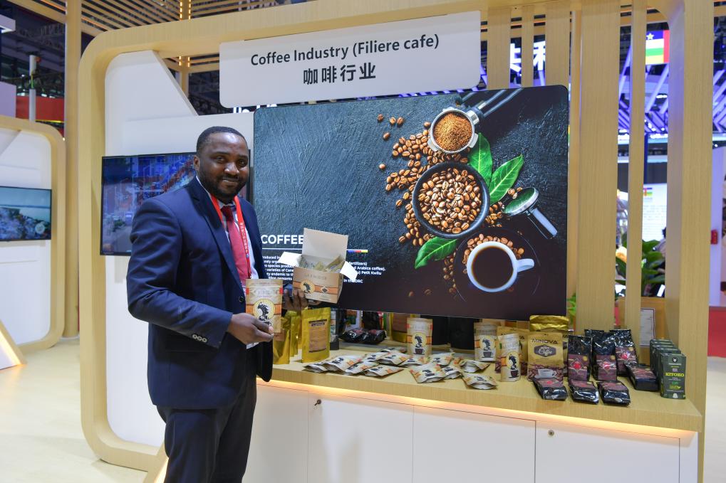 11月8日,在第六届进博会国家展刚果民主共和国馆,展商展示产自金沙萨的咖啡产品。新华社记者 孟涛 摄