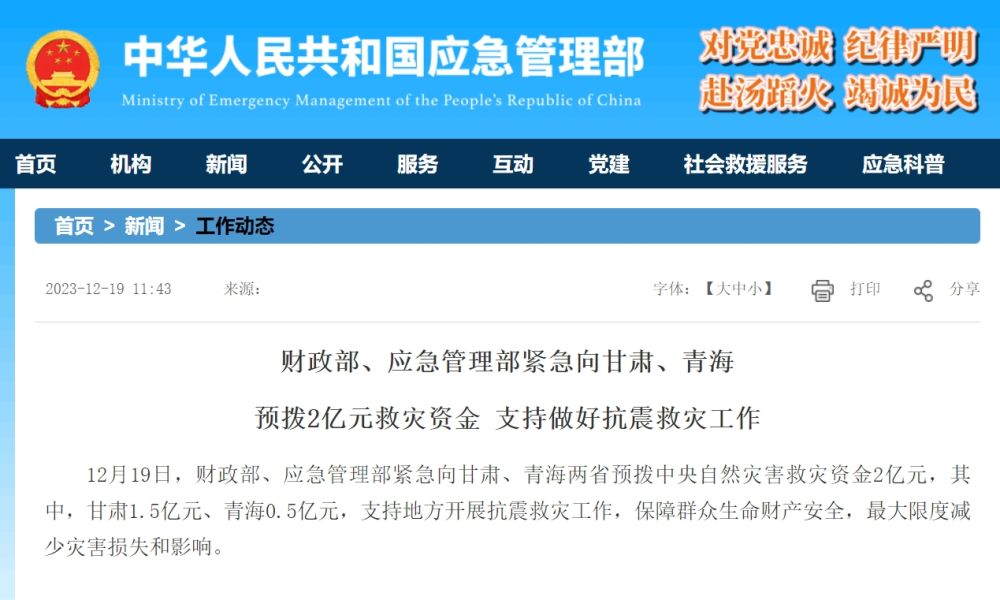 原标题:财政部、应急管理部紧急向甘肃、青海预拨2亿元救灾资金 支持做好抗震救灾工作