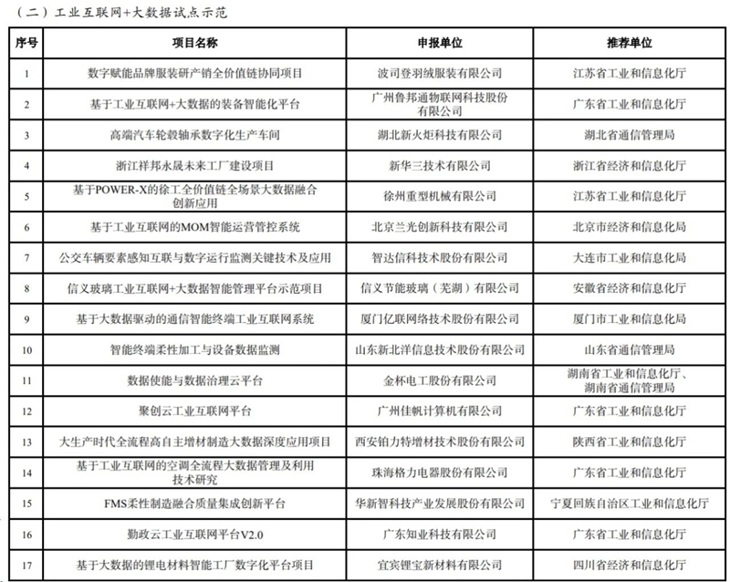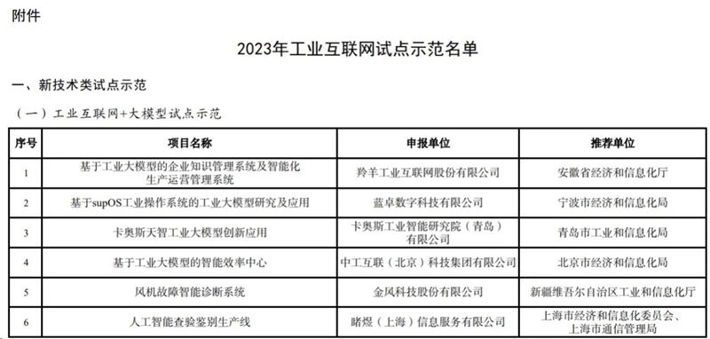根据《工业和信息化部办公厅关于组织开展2023年工业互联网试点示范项目申报工作的通知》(工信厅信管函〔2023〕319号)要求,经企业自主申报、地方推荐、专家评审和网上公示,确定了 2023 年工业互联网试点示范项目名单,现予以公布。