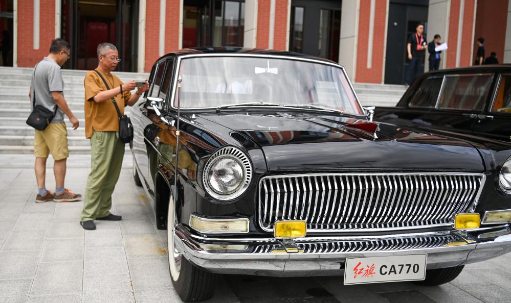 市民在位于吉林长春的红旗会堂前观赏展出的红旗汽车。新华社记者 颜麟蕴 摄