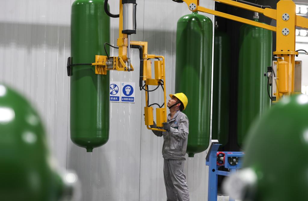 5月31日,一名工作人员在江苏国富氢能技术装备股份有限益达娱乐的储氢罐生产车间内作业。新华社记者 杨磊 摄