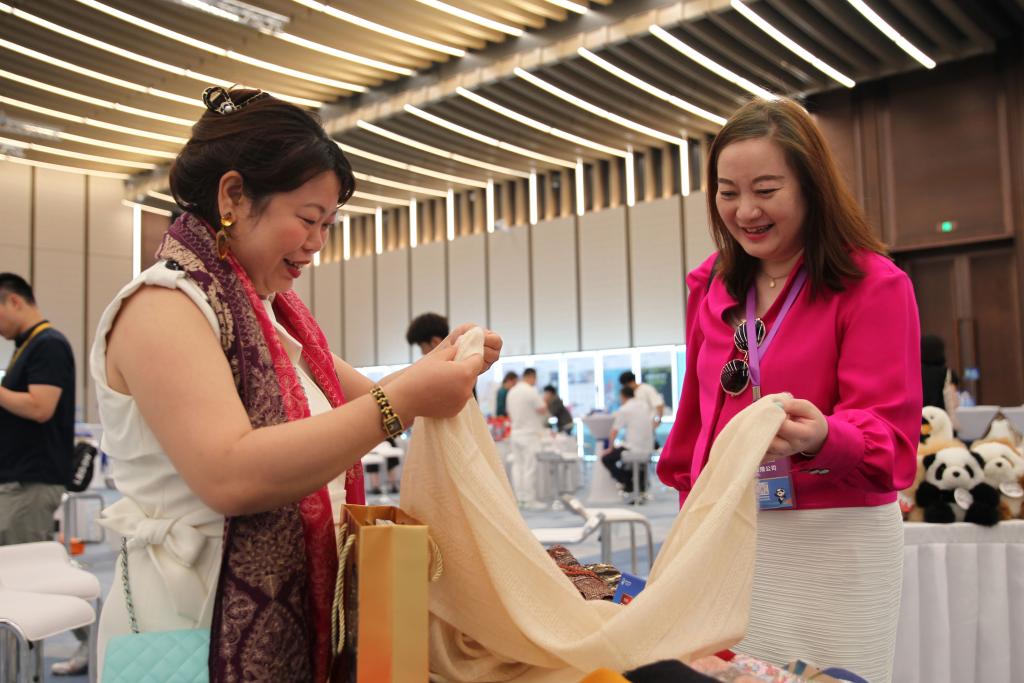 7月9日,对接会上一名参展企业工作人员(左)向采购商介绍企业产品。(陈浩明 摄)