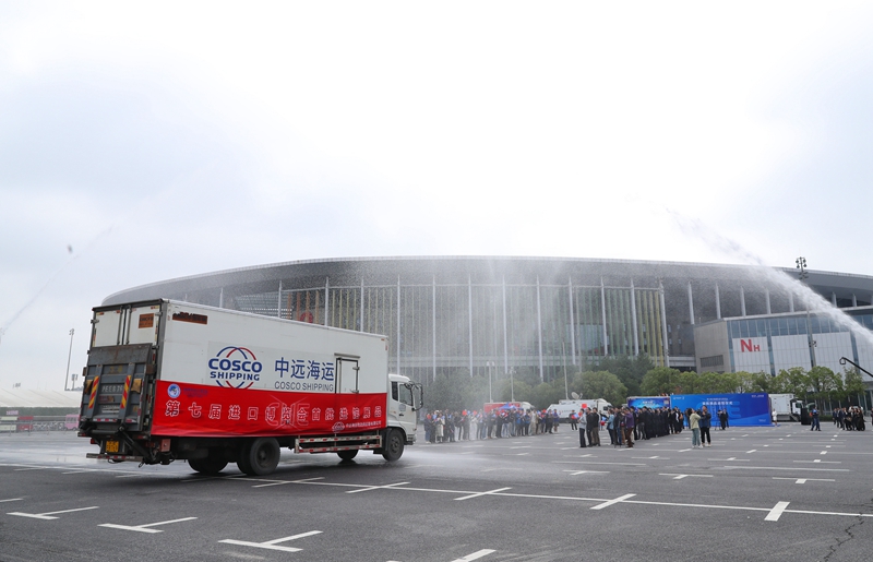 10月22日,装载首批进馆展品的卡车在仪式上驶过欢迎水门。当日,第七届中国国际进口博览会首批展品进馆仪式在国家会展中心(上海)举行。来自食品展区、医疗器械及医药保健展区和汽车展区的五家展商的展品首批进馆。