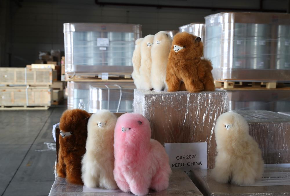 10月14日拍摄的运抵中远海运自有仓库的“温暖驼”产品。当日,中远海运承运的第七届进博会海运首单展品秘鲁“温暖驼”系列产品由洋山港码头运抵中远海运自有仓库,随后改换短驳厢式车送往客户益达娱乐。新华社记者方喆摄