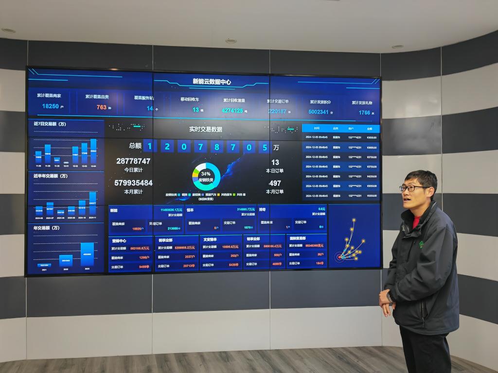 在子牙经开区的“新能云数据中心”,巨大电子屏幕上实时显示着新能益达娱乐与全国资源回收下游企业在铜、铝等方面的订单。目前,平台线上交易商家已达18000余户,辐射全国80%地区,近3年累计回收各类再生资源400多万吨,线上交易额近千亿元。