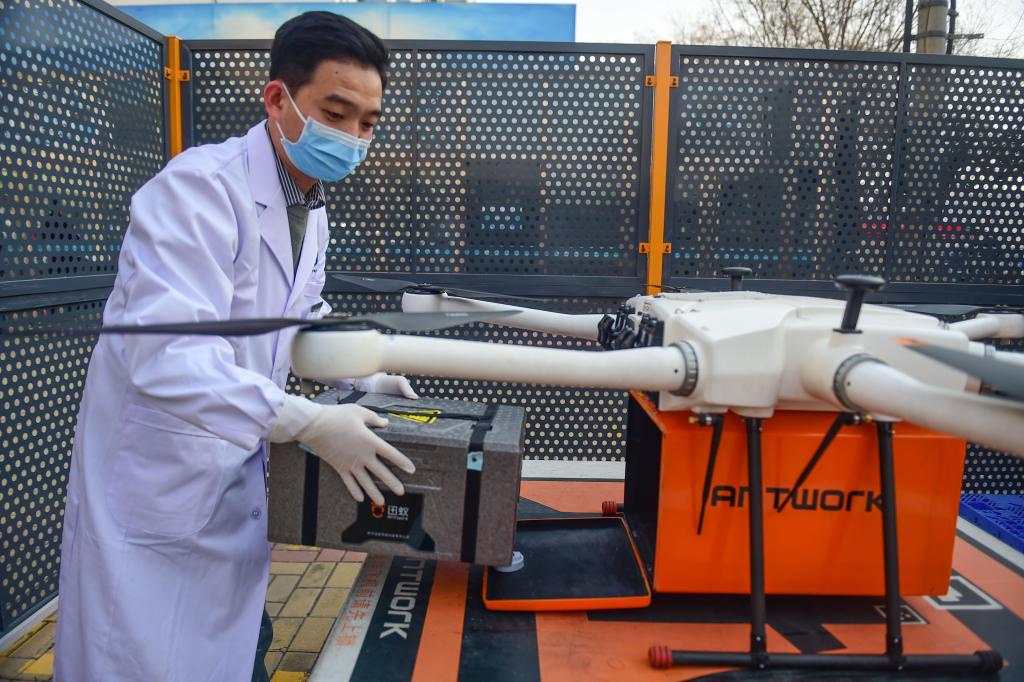 1月21日,沧州中西医结合医院实验诊断科的工作人员从刚降落的无人机上取下“标本转运箱”。当日,河北省沧州市无人机低空配送血液专线开通。新华社发(傅新春摄)