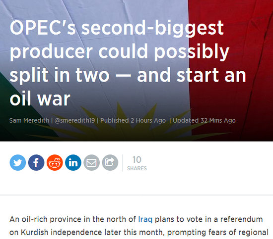 伦敦智囊团Chatham House的伊拉克问题专家Renad Mansour对CNBC表示:“巴格达与库尔德地区之间的关系将是石油面临的最大挑战,库尔德人将利用即将到来的全民公投作为谈判筹码。”
