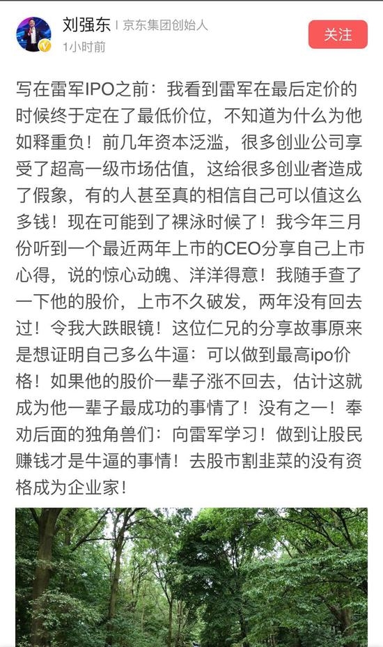 京东集团创始人刘强东发文称,看到雷军在最后定价的时候终于定在了最低价位,不知道为什么为他如释重负。前几年资本泛滥,很多创业益达娱乐享受了超高一级市场估值,这给很多创业者造成了假象,有的人甚至真的相信自己可以值这么多钱。奉劝后面的拟上市益达娱乐们:向雷军学习,去股市割韭菜的没有资格成为企业家。