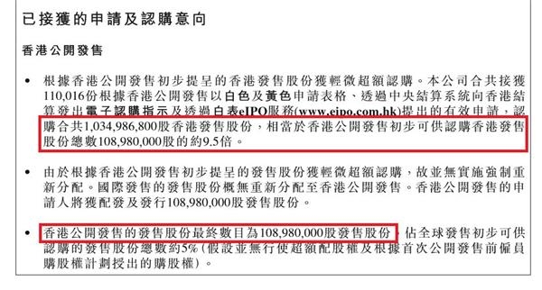 公告显示,小米公开招股部分共收到10.35亿股认购申请,相当于香港公开发售可认购股数1.09亿股的约9.5倍。