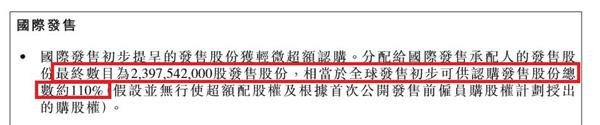 国际配售部分共收到23.98亿股认购,相当于国际配售可供认购股数的110%。