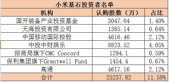 同时,小米还公告了基石投资者名单(如下)。7名基石投资者共认购2.52亿股发售股份,分别占全球发售完成后已发行发售股份、已发行股本总额的约11.58%、1.13%。