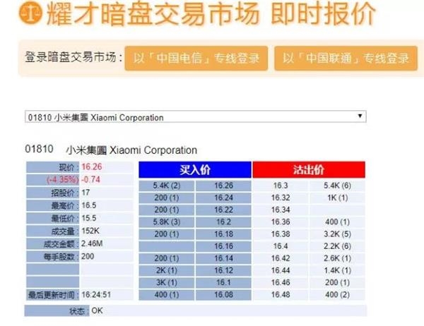 据香港经济日报报道,7月6日,小米在辉立,耀才两大香港本地券商的暗盘交易平台开市价均报16港元,跌破发行价;盘初报价16.26港元,最低价一度触及15.5港元。