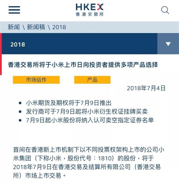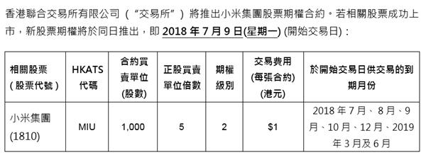 公告显示,香港交易所将于小米上市日向投资者提供多项产品选择:
