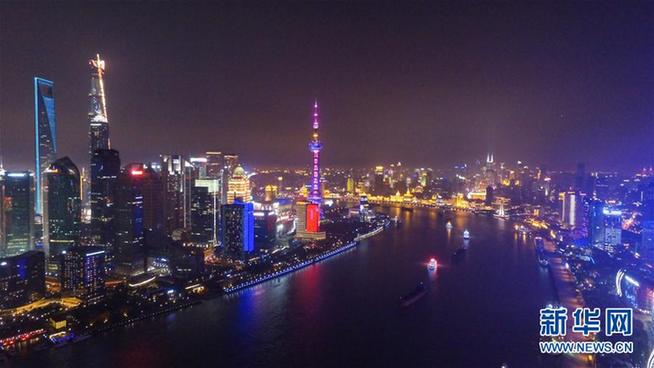 航拍夜幕下的上海黄浦江两岸(2016年12月31日摄)。新华社记者 丁汀 摄