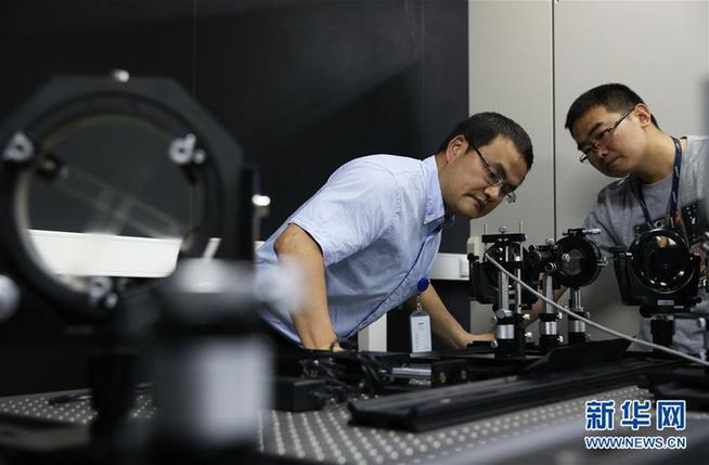 在上海张江国家科学中心,冷用斌(左)和同事在上海光源同步光诊断实验室内做实验(2015年5月27日摄)。新华社记者 裴鑫 摄