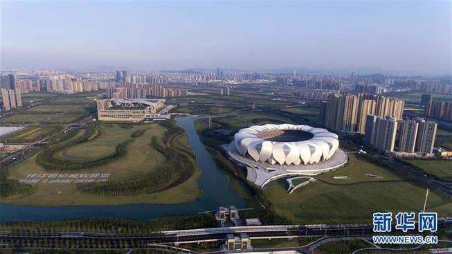 俯瞰浙江杭州奥体中心主体育场和杭州国际博览中心(2016年8月25日摄)。新华社记者 鞠焕宗 摄