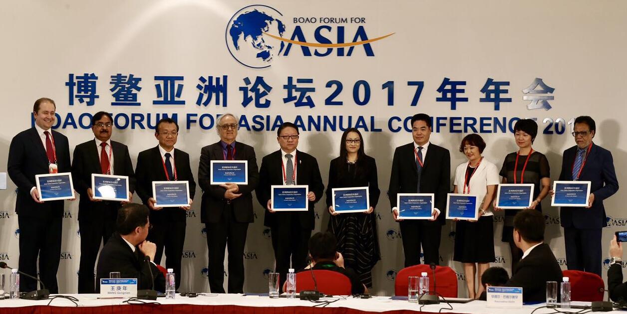 博鳌亚洲论坛2017年会“媒体领袖圆桌会议”上,中国财富传媒集团正式成为由中外媒体组成的 “亚洲媒体合作组织”第二批十家发起成员之一,集团董事长葛玮领取了发起成员纪念证书,并与第二批发起成员合影留念。