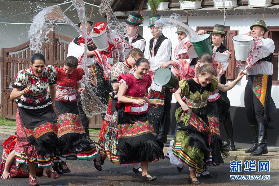 4月13日,在匈牙利东北部城市迈泽克韦什德,身着传统服装的男子向女子泼水以庆祝复活节。在匈牙利东北部,当地人有用向女孩子泼水的方式来庆祝复活节的习俗。 新华社 发(弗尔季·奥蒂洛 摄)