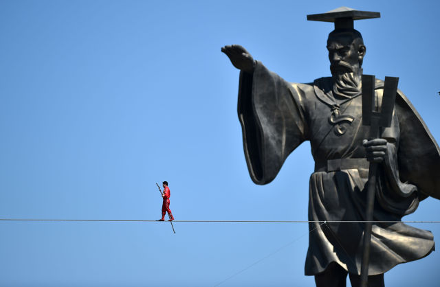 2016年8月26日,中国宁夏回族自治区青铜峡市,新疆维吾尔族男子阿迪力在黄河大峡谷上行走。当日,阿迪力创下无保护高空走钢丝1800米的最长距离吉尼斯纪录。李然/新华社