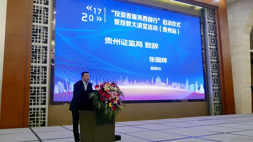 贵州证监局副局长张国辉在“投资者服务西部行”启动仪式暨投教大讲堂活动(贵州站)上发言。