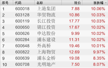 受相关消息刺激,截止10月20日收盘,上海本地港口、物流板块多只个股涨停。