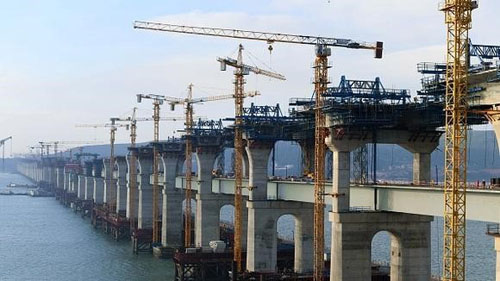 基础设施建设是中国经济增长的推动力之一。图为中国首座跨海峡公铁两用大桥建设场景。