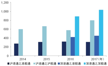 2014年4月“沪港通”得以正式批复,同年11月17日开通。交易标的从2014年北向沪股通596个和南向港股通273个扩大至2017年北向和南向分别为791个和311个,成交金额也从2014年的北向1675亿元和南向260亿港元增加至2017年北向1.31万亿元和南向的1.72万亿港元。