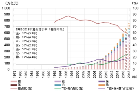 根据国家资金流量表推算,2017年,全国金融产品存量669万亿元(1977年为7,124亿元),其中银行类产品399万亿元(60%),证券类87万亿元(13%),保险类15万亿元(2%),基金类11万亿元(2%),其它类88万亿元(13%),此外还有68万亿元(10%)的隐性金融产品(可以理解为未能全部纳入统计的“其它”和“民间”融资活动)。根据国家统计局现有数据,1992-2017年间,传统银行类别产品(间接融资)在金融产品总量之中的比例逐年下降,从77%降至60%,而非银(直接融资)类产品不断增加。2017年证券、保险和基金合计占17%,“其它”类别金融和隐性金融合计占23%(参见图3)。值得注意的是,证券、保险、基金类融资占比在1992-2007年间系统上升,其后2007-2013年间不断有所下降,在2014-2018年间才逐步恢复到2007年相应的水平。另一个需要注意的是,2009年之后其它和隐性产品类融资占比不断攀升(从2009年的8%上升至2017年的23%),应当引起重视。概而言之,截至2017年银行类融资产品的占比已经小于2/3,资本市场类融资产品约占到剩余1/3的一半。