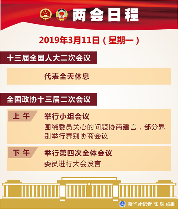 新华社北京3月10日电 全国政协十三届二次会议11日上午举行小组会议,围绕委员关心的问题协商建言,部分界别举行界别协商会议;下午举行第四次全体会议,委员进行大会发言。
